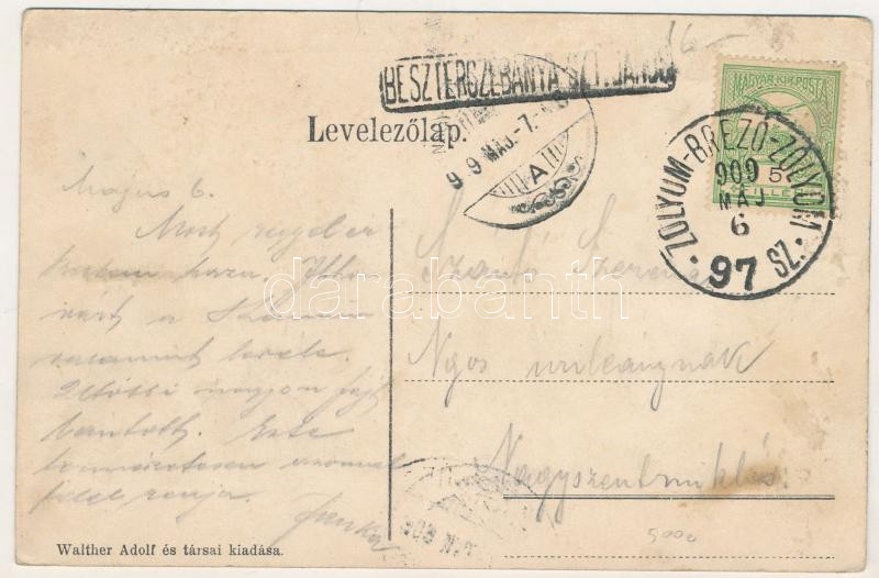 Description: 1909 Besztercebánya, Banská Bystrica; Garam, Szent János (Szentjános) vasútállomás. Walther Adolf és társai kiadása / Bahnhof / Hron riverside, railway station Banská Bystrica mesto + "ZÓLYOM-BREZÓ - ZÓLYOM 97. SZ." vasúti mozgóposta bélyegző (ázott / wet damage)