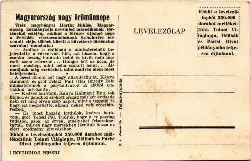 Felvidék visszacsatolásának emlékére. Áldott anyaföldünk visszajött... Vitéz Imrédy Béla, Gróf Teleki Pál, Kánya Kálmán. Tolnai Nyomda kiadása / Entry of the Hunagrian troops, Irredenta, Art Nouveau (EB)