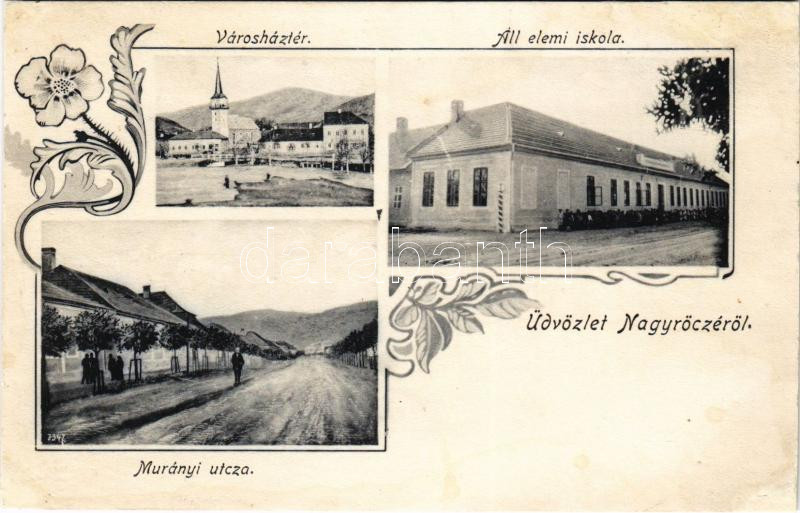 Description: Nagyrőce, Gross-Rauschenbach, Velká Revúca; Városház tér, Állami elemi iskola, Murányi utca / town hall square, school, street. Art Nouveau, floral (r)