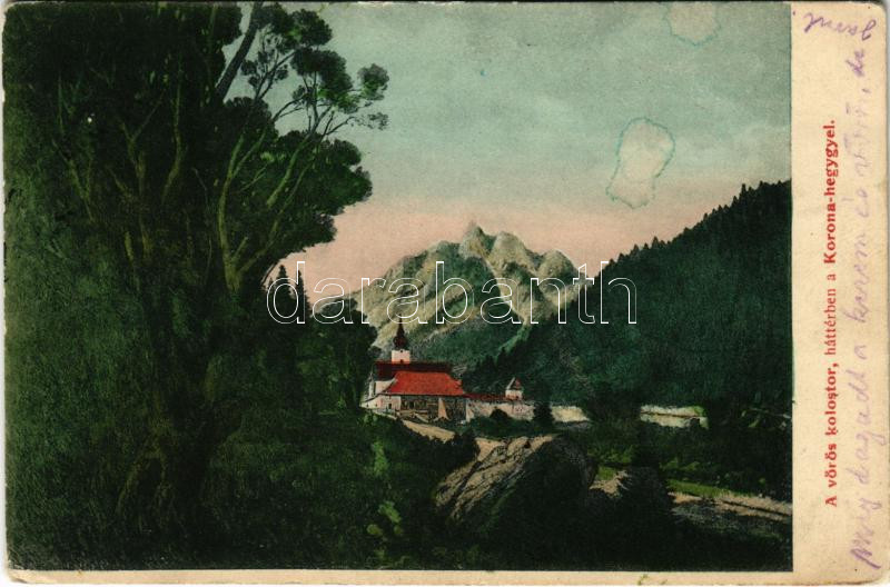 Description: Vöröskolostor, Cerveny Klástor (Alsólehnic, Pod Lechnica); Vörös kolostor, háttérben a Korona-hegy. Divald Károly Fia kiadása / monastery, Tri Koruny mountain (EK)