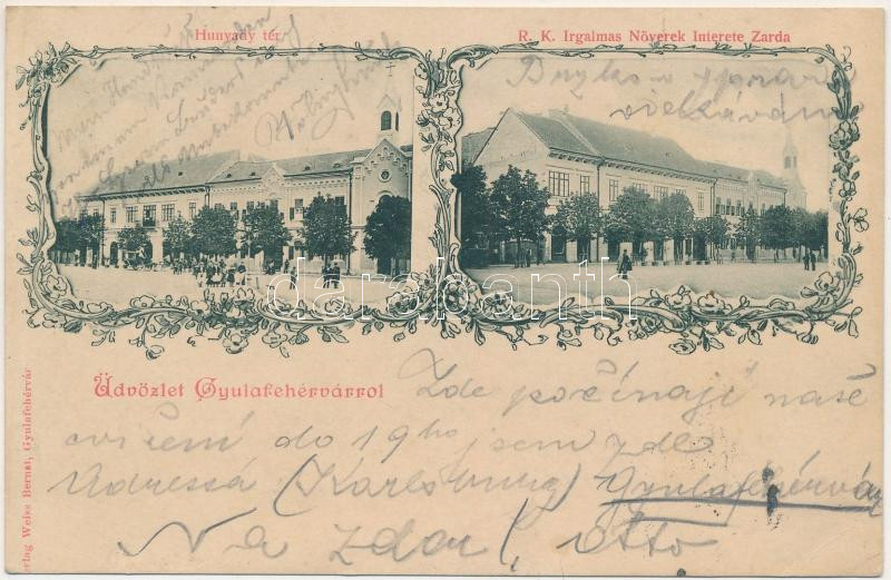 1899 (Vorläufer) Gyulafehérvár, Karlsburg, Alba Iulia; Hunyady tér, Római katolikus Irgalmas Nővérek intézetének zárdája. Weisz Bernát kiadása / square, nunnery. Art Nouveau, floral (EK)