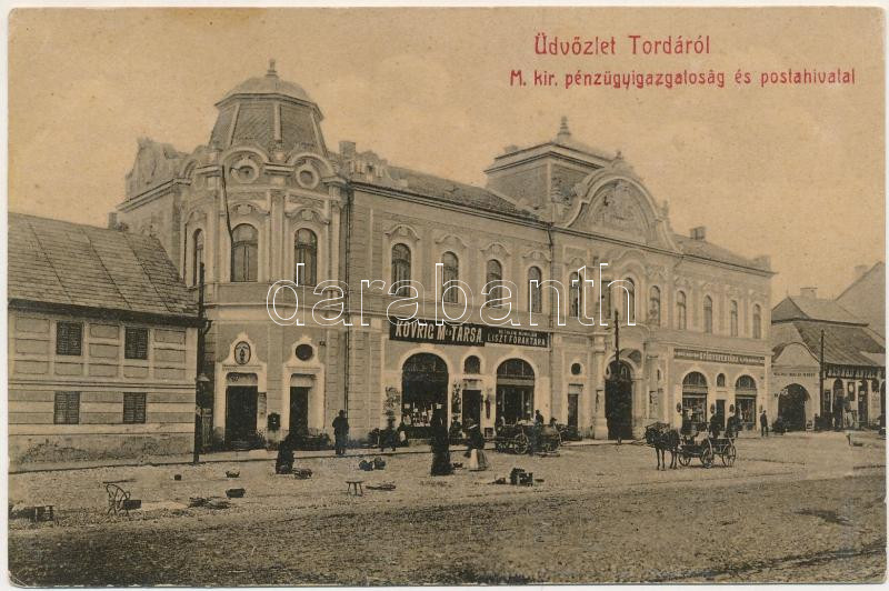 1907 Torda, Turda; M. kir. pénzügyigazgatóság és postahivatal, Kovrig M. és Társa, Bernád Antal üzlete, Mészáros társulati vendéglő, gyógyszertár, piac. No. 424. (W.L. ?) / financial directorate, post office, shops, restaurant, pharmacy, market (fl)