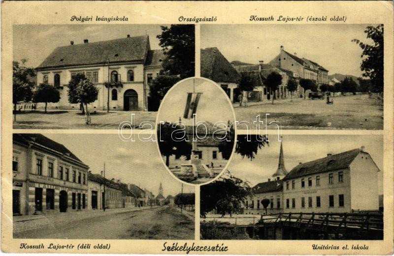 Description: Székelykeresztúr, Kristur, Cristuru Secuiesc; Polgári leány iskola, Kossuth Lajos tér északi és déli oldala, Országzászló, Unitárius elemi iskola / schools, square, Hungarian flag (EB)