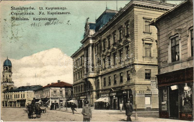 1915 Ivano-Frankivsk, Stanislawów, Stanislau; Ul. Karpinskiego / Karpinskigasse / street view, shops of Reischer, Pinkas (holes)