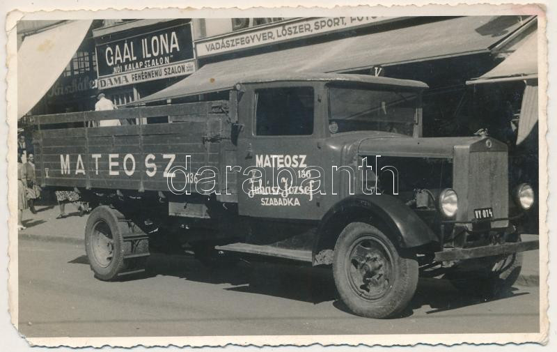Szabadka, Subotica; Gaál Ilona női kalap szalon, Dáma fehérnemű szalon, vadászfegyver, lőszer üzlet, MATEOSZ (Magyar Teherfuvarozók Országos Szövetkezete) V. 136 teherautó (Juhász József). photo (EM)