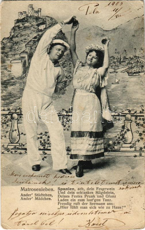 1903 K.u.k. Kriegsmarine Matrosenleben in Spanien / Osztrák-magyar haditengerész matróz Spanyolországban, propaganda / Austro-Hungarian Navy mariner in Spain, propaganda (EK)
