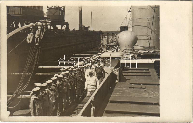 Description: 1917 SMS NOVARA cs. és kir. haditengerészet Helgoland-osztályú gyorscirkáló fedélzete IV. Károly és Maximilian Njegovan Admirális látogatásakor / K.u.K. Kriegsmarine / WWI Austro-Hungarian Navy, damaged SMS Novara after the battle of Otranto, Charles I of Austria and Admiral Maximilian Njegovan on deck. photo