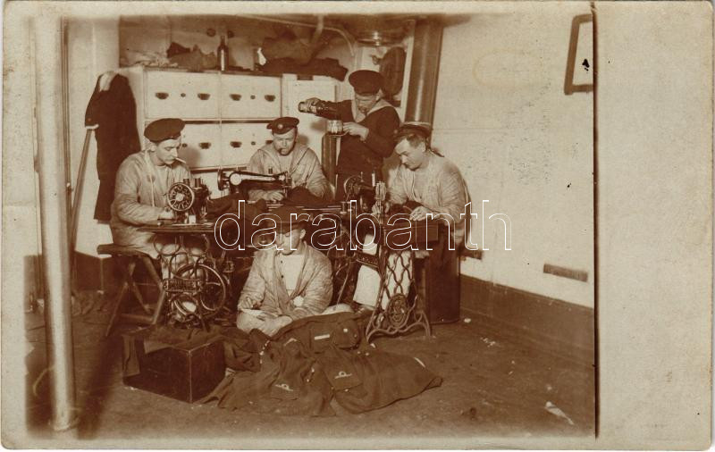 Description: SMS Erzherzog Karl osztrák-magyar Erzherzog-osztályú pre-dreadnought csatahajójának varróműhelye, cigiző és söröző matrózok Singer varrógépekkel varrás közben / K.u.K. Kriegsmarine Matrosen / Austro-Hungarian Navy cigarette smoking and beer drinking mariners with sewing machines in the sewing workshop. photo