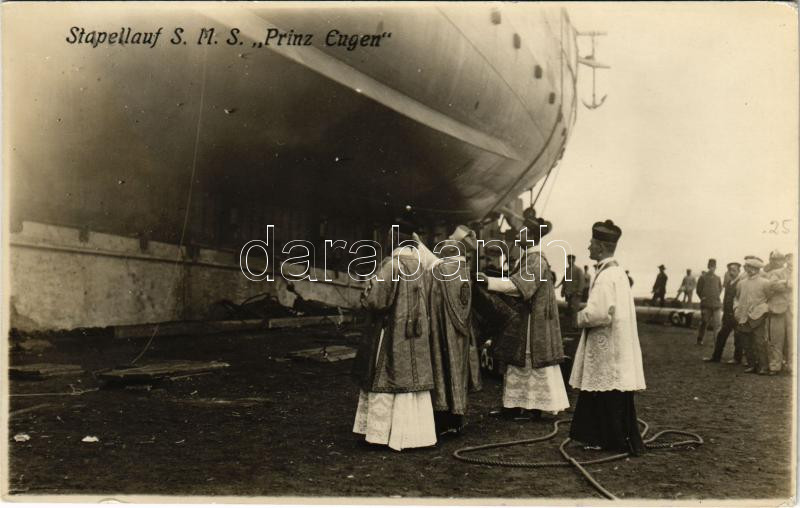 SMS PRINZ EUGEN Osztrák-Magyar Haditengerészet pre-dreadnought csatahajójának vízre bocsátása, katolikus papok áldás közben / Stapellauf SMS "Prinz Eugen" K.u.K. Kriegsmarine / Austro-Hungarian Navy, launch of pre-dreadnought battleship SMS Prinz Eugen, Catholic priests blessing the ship. Bediene dich selbst photo (EK)