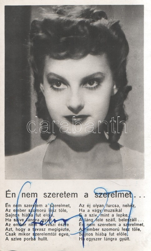 Description: Szeleczky Zita (1915-1999) színésznő aláírt, fiatalkori fényképe. Mérete: 140x85 mm, hátoldalán régi ragasztónyomok. A kép alján a ,,Karosszék" című film ,,Én nem szeretem a szerelmet..." című betétdalának szövege.