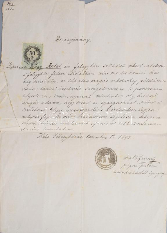 Description: 1872 Félegyháza (Kiskunfélegyháza), Szabó Ferenc plébános, iskolaigazgató által kiállított ajánlólevél (bizonyítvány) Kanizsai Nagy Antal, a félegyházi főelemi iskola tanítója részére, pecséttel, 50kr okmánybélyeggel. Kissé foltos, sérült, javított.