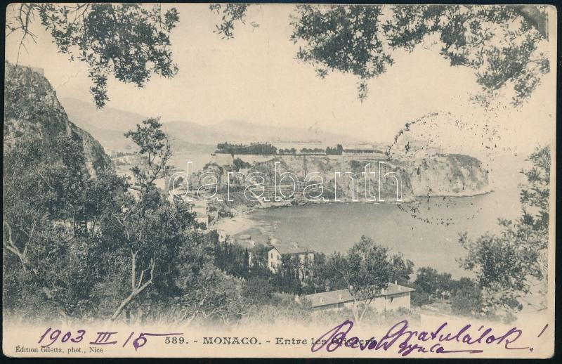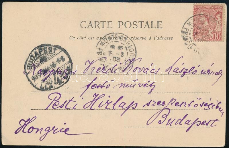 1903 Basch Gyula (1851-1928) festÅ‘művész autográf gratuláló sorai és aláÃrása Kézdi-Kovács László (1864-1942) festÅ‘művész, műkritikushoz a Pesti HÃrlap szerkesztÅ‘ségébe, Monacoból küldött képeslapon.