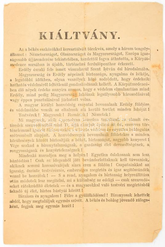 1940, Kiáltvány a Észak-Erdélyben élők számára, tájékoztatva őket a magyar királyi honvédség csapatainak bevonulásáról.