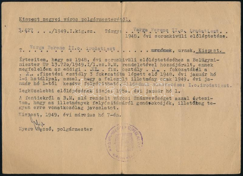 1949 Kispest, Nyers Rezső (1898-1956) polgármester aláírása kinevezési...