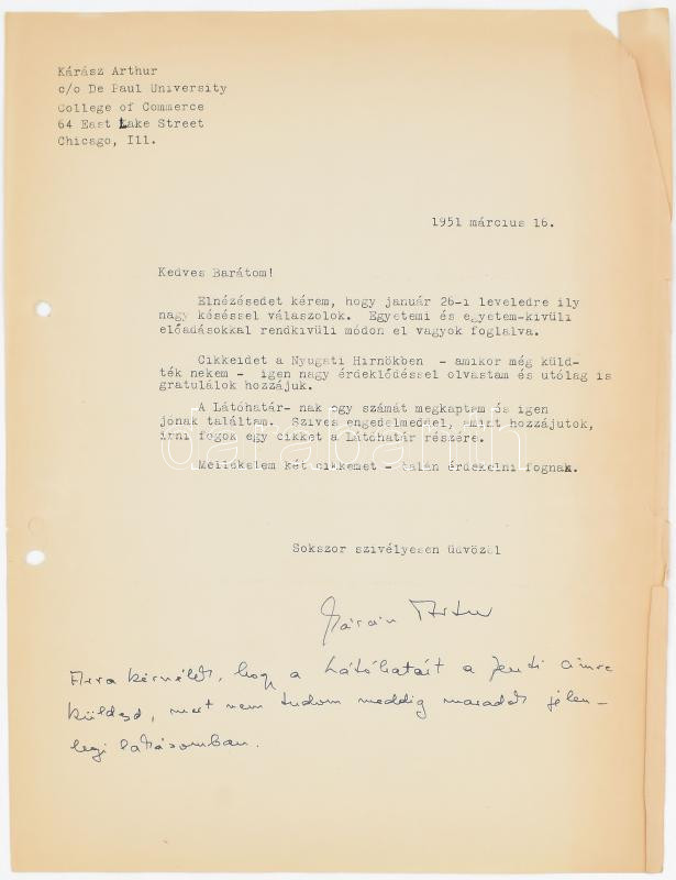 1951 Kárász Artúr (1907-1992) közgazdász, gazdaságpolitikus, egyetemi tanár, a Magyar Nemzeti Bank elnöke (1945), majd később a Világbank európai igazgatója (1968-1972) gépelt levele, autográf aláírásával és végén 3 autográf sorral Molnár József (1918-2009) emigráns magyar író, könyvkiadó, nyomdász, folyóirat szerkesztő, az Aurora Kiadó szerkesztője részére.