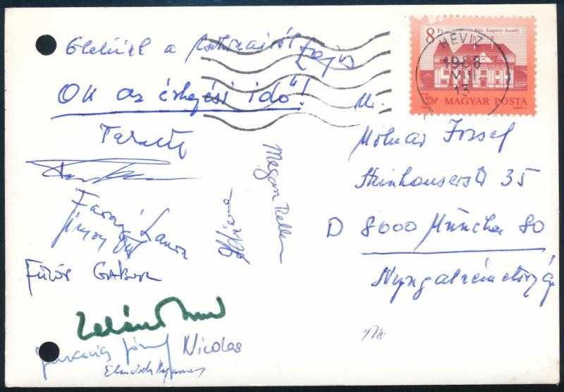 1988 Hévíz, Csokonai Asztaltársaság később Csokonai Vitéz Mihály Irodalmi és Művészeti Társaság tagjainak aláírásai egy Molnár József (1918-2009) emigráns magyar író, könyvkiadó, nyomdász, folyóirat szerkesztő, az Aurora Kiadó szerkesztője részére, Münchenbe küldött képeslapon. Az aláírók között: Takáts Gyula 1911-2008) Kossuth-díjas költő, író, Major-Zala Lajos (1930-2006) költő, Zalán Tibor (1954-) költő, író, Faragó Laura (1949-) népdalénekes, Fülöp Gábor (1950 - ) költő, műfordító és mások. Az utóbbi Fülöp Gábor 1988-ban megkapta a társaság Csokonai-díját.