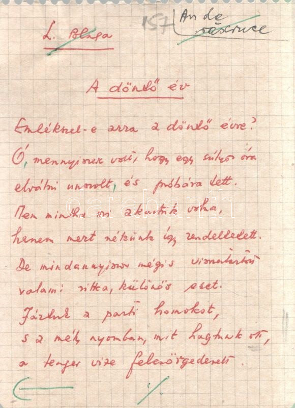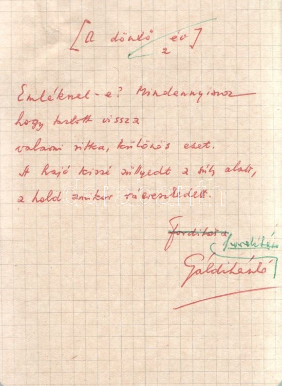 Gáldi László (1910-1974) nyelvész, irodalomtörténész, műfordító Lucian Blaga (1895-1961) román költő ,,A döntő év" című költeményéről készített műfordításának saját kézzel írott, két oldal terjedelmű, saját kézzel javított eredeti kézirata. Kelt: Budapest, 1964 körül. Két levél, mérete egységesen: 133x95 mm, 19 beírt sor. Lucian Blaga (1895-1961) a XX. század egyik legjelentősebb román gondolkodója, változatos élete során újságíró, költő, drámaíró, diplomata, egyetemi tanár és kultúraszervező, 1948 után könyvtáros és műfordító volt. Élete során hét verseskötete jelent meg, de 1948 után hallgatásra ítélték, az utolsó két évtized (1943-1961) versei csak halála után jelentek meg. Az expressszionista szabadversekkel induló Lucian Blaga hamar utat talált a mély gondolati tartalmakhoz és a kötött formákhoz, egyszersmind a román-magyar-szász együttélést szorgalmazó Blaga jelentőségét hamar felismerték a transzilvánista erdélyi magyar költők: méltatása és fordítása már az 1930-as években megkezdődött - Dsida Jenő, Áprily Lajos, Szemlér Ferenc tolmácsolta sok versét. Első reprezentatív verseskötete magyarul az 1960-as évek derekán, a román-magyar kulturális kapcsolatok kedvező idejében, az Európa Könyvkiadónál jelent meg, melybe a költő életében megjelent hét verseskötet válogatott versei mellett a hallgatásra ítélt korszak (1948-1961) költeményei is bekerültek. A ,,Mágikus virradat" címen megjelenő Blaga-versválogatás Domokos Sámuel válogatásában és előszavával jelent meg (Budapest, 1966). Áprily, Jékely Zoltán és Szemlér fordításai mellett Baranyi Ferenc és a jeles romanista Gáldi László fordította a versek zömét, Gáldi László nyelvész az érett (és hallgatásra ítélt) Blaga költeményei közül fordított. Tételünk, ,,A döntő év" című költemény a gyűjtemény 317. oldalán jelent meg. Jó állapotú lapok, iratkapoccsal összetűzve.