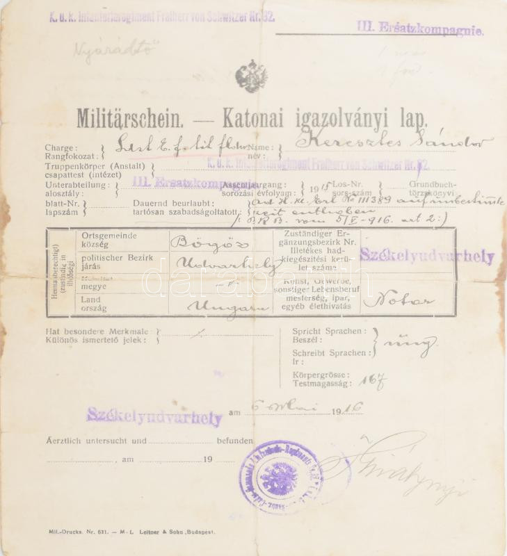 1916 Székelyudvarhely, katonai igazolványi lap (Militärschein) a cs. é... https://www.darabanth.com/en/470-Online-auction/470.0/Art-and-other-collectibles/Military~1000010/1916-Szekelyudvarhely-katonai-igazolvanyi-lap-Militarschein-a-cs-es-kir-82-szekely~II3184507