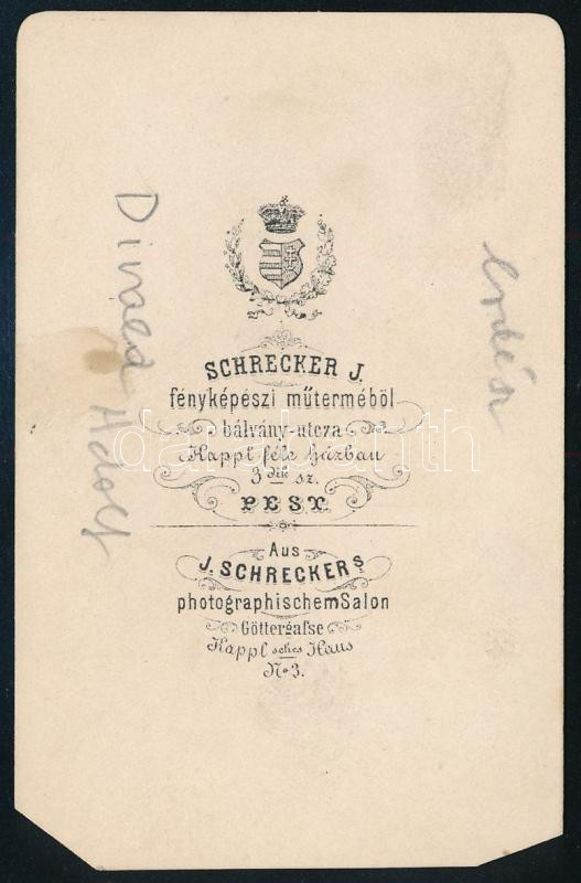 Description: 1865 Divald Adolf (1828-1891) erdőmérnök, a magyarországi erdészet tudományos közéletének úttörője, a magyar nyelvű erdészeti szakirodalom megalapozója; vizitkártya Schrecker Ignác (1834-1888) pesti műterméből, alsó sarkai vágottak, 9,5x6 cm