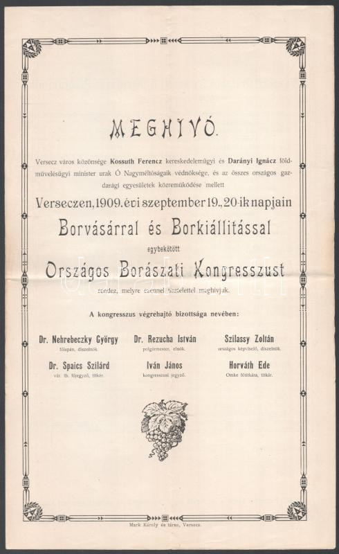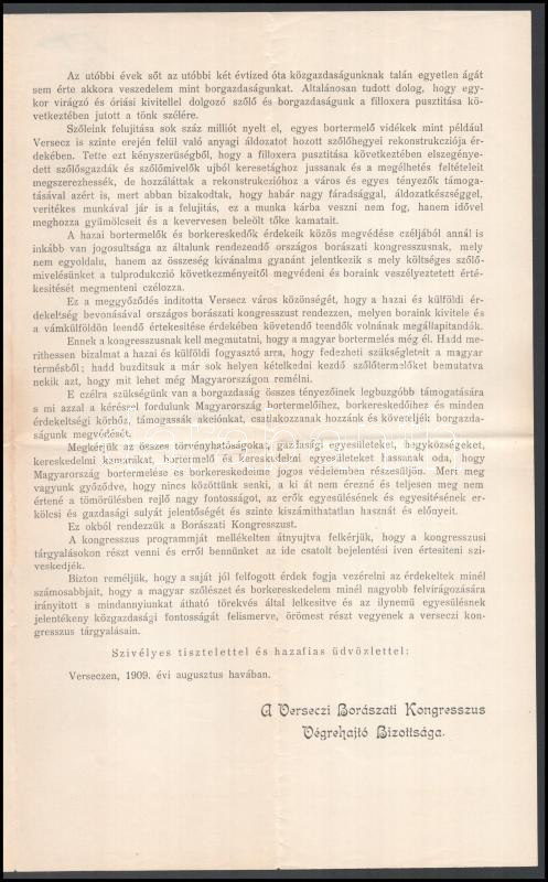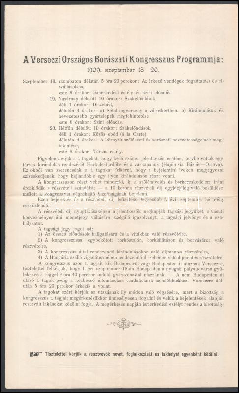 Description: 1909 Borászati tétel: Törvényjavaslat a természetes borok védelméről + Meghívó Borvásárral és Borkiállítással egybekötött Országos Borászati Kongresszusra. Versecre 44 p.
