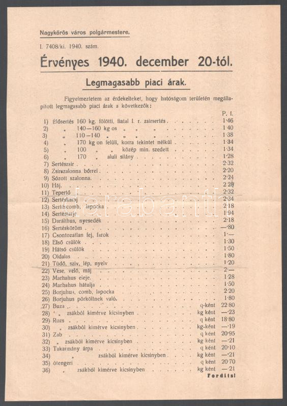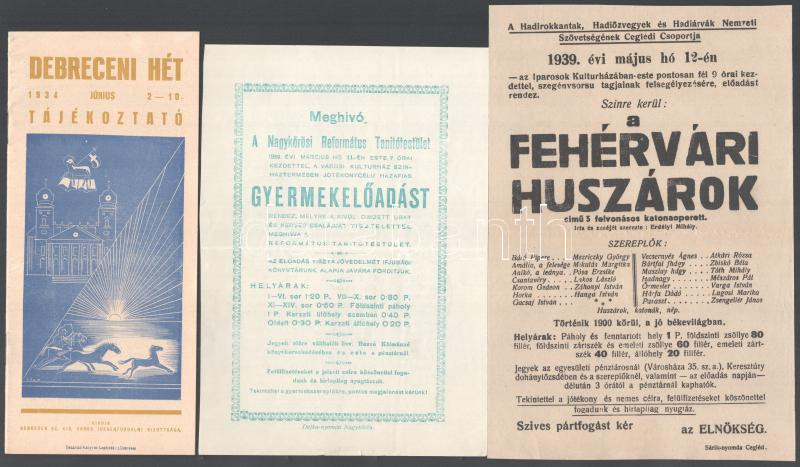 Description: 1939 4 db nyomtatvány: Fehérvári huszárok ceglédi színházi plakát, nagykőrösi gyermekelőadás plakátja, piaci árak szabályozása, hirdetmény, Debreceni hét reklám nyomtatvány