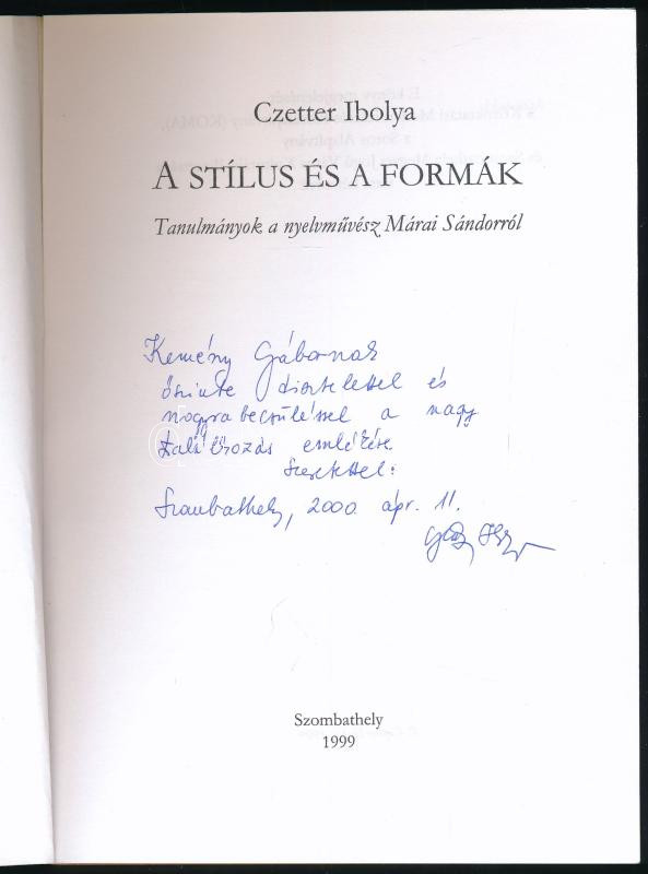 Description: Czetter Ibolya: A stílus és a formák. A szerző, Czetter Ibolya (1964 - ) nyelvész, irodalomtörténész által DEDIKÁLT példány! Tanulmányok a nyelvművész Márai Sándorról. Szombathely, 1999, Bár. Kiadói papírkötés.