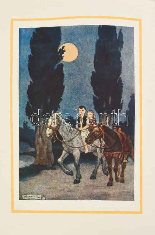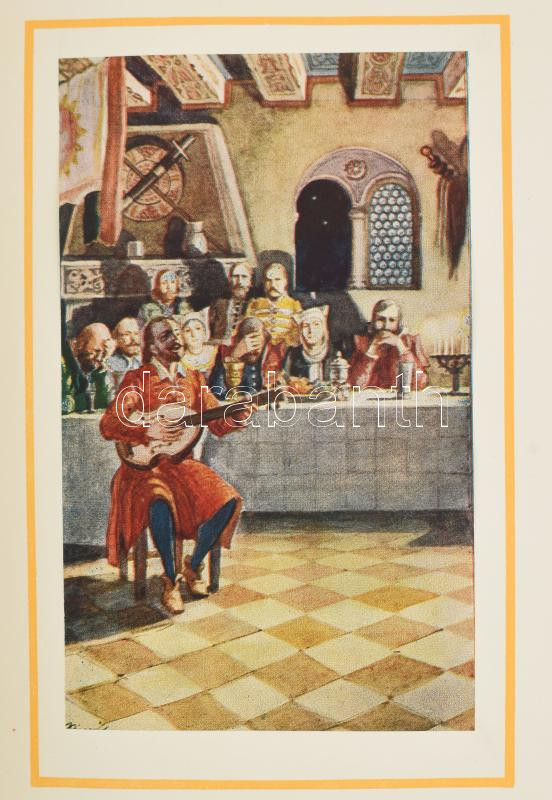 Description: Gárdonyi Géza: Egri csillagok. Biczó András színes képeivel és rajzaival díszített kiadás. Bp.,én.,Dante, (Krakauer-ny.),332+323+1 p. + 5 (színes képtáblák) t. 9. kiadás. Fekete-fehér szövegközti és egészoldalas képanyaggal illusztrált. Kiadói javított gerincű illusztrált félvászon-kötés, kopott borítóval.