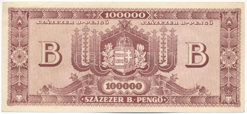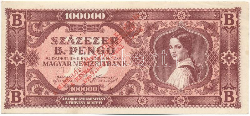 Description: 1946. 100.000BP "A Miskolci Éremgyűjtők Kiállítása a Hermann Ottó Múzeumban 1969. aug. 5.-től 31-ig" felülbélyegzéssel T:AU,XF hajtatlan, de a sarkoknál hajtásnyomok, hibák