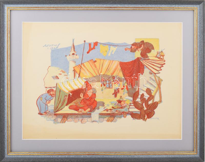Description: Oskar Laske (1874-1951): maruf, a kairói cipész (Maruf, der Schuster von Kairo). Litográfia, papír, jelzett a litográfián, üvegezett fakeretben, 21x31 cm