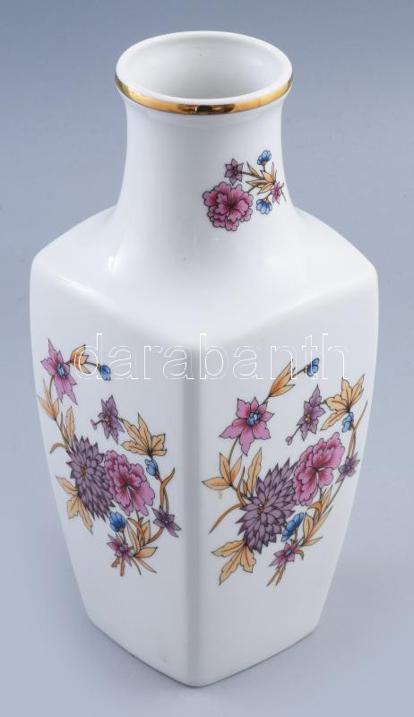 Hollóházi négyoldalas virágmintás váza, jelzett, m: 24 cm