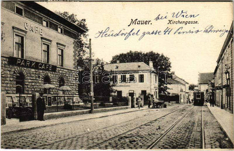 1925 Wien, Vienna, Bécs XXIII. Mauer, Kirchengasse, park Cafe / street, tram