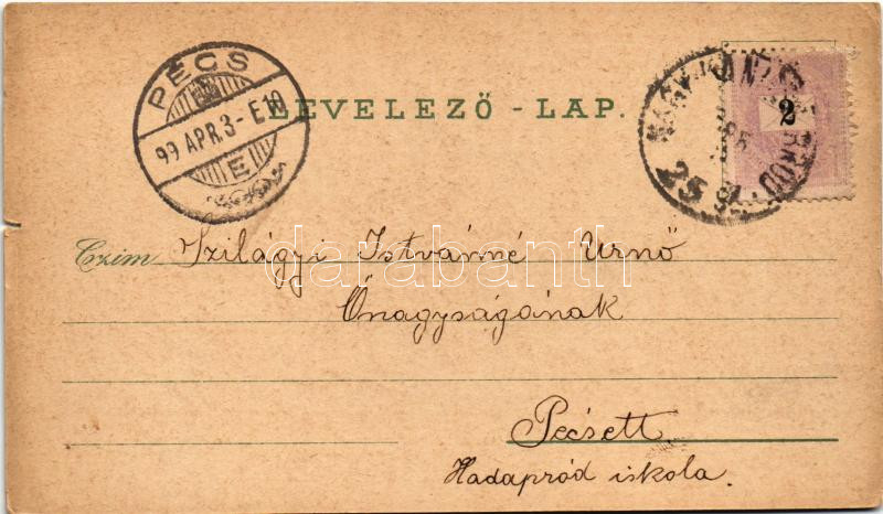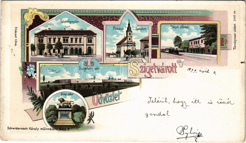 1899 (Vorläufer) Szigetvár, Takarékpénztár, plébániatemplom, vasútállomás, pályaudvar, gőzmozdony, vonat, vár, Zrínyi szobor. Schwidernoch Károly Art Nouveau, floral, litho (szakadás / tear)