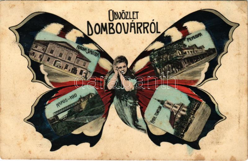 1905 Dombóvár, Korona szálloda, Kapos híd, pályaudvar, vasútállomás, Katolikus templom. Pillangó hölgy szecessziós montázsban / Art Nouveau (fl)