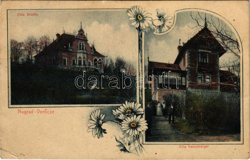 Description: 1911 Verőce, Nógrádverőce; Svadlo Ferenc borász és borkereskedő és Kamizberger villája. Vavrik Géza kiadása, Art Nouveau, floral (ázott / wet damage) + "WIEN-POZSONY-BUDAPEST A. 2." vasúti mozgóposta