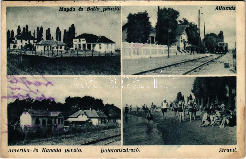 1936 Balatonszárszó, Amerika és Kanada pensio, strand, Magda és Balla penzió, vasútállomás, vagon (fl)