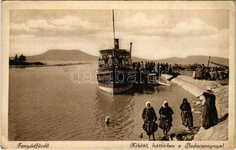 Fonyódfürdő, kikötő a háttérben a Badacsonnyal, mosóasszonyok, gőzhajó...