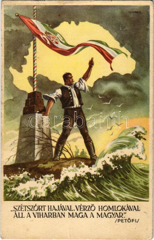 Description: Szétszórt hajával, verző homlokával áll a viharban maga a magyar (Petőfi). Kiadja az Ereklyés Országzászló Nagybizottsága / Hungarian irredenta propaganda s: Lamoss (szakadás / tear)