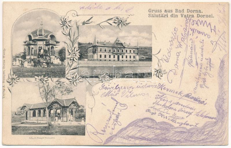 1916 Vatra Dornei, Dornavátra, Bad Dorna-Watra (Bukovina, Bucovina, Bukowina); Musik Pavillion, Curhotel, Arcadie Quelle. A. Stamper / music pavilion, spa hotel, mineral water spring. Art Nouveau, floral