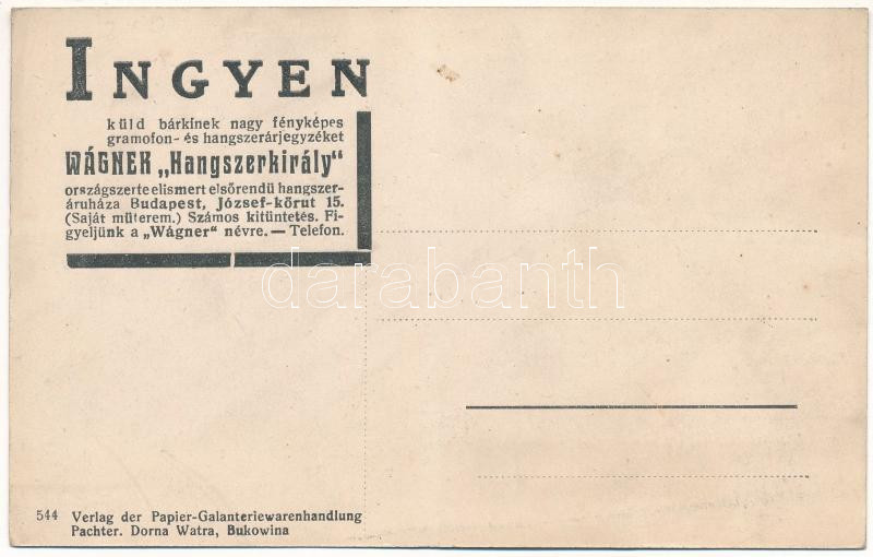 Description: Vatra Dornei, Dornavátra, Bad Dorna-Watra (Bukovina, Bucovina, Bukowina); Mikuligasse / Strada lui Miculi / street. "Wágner Hanszerkirály" advertisement on the backside