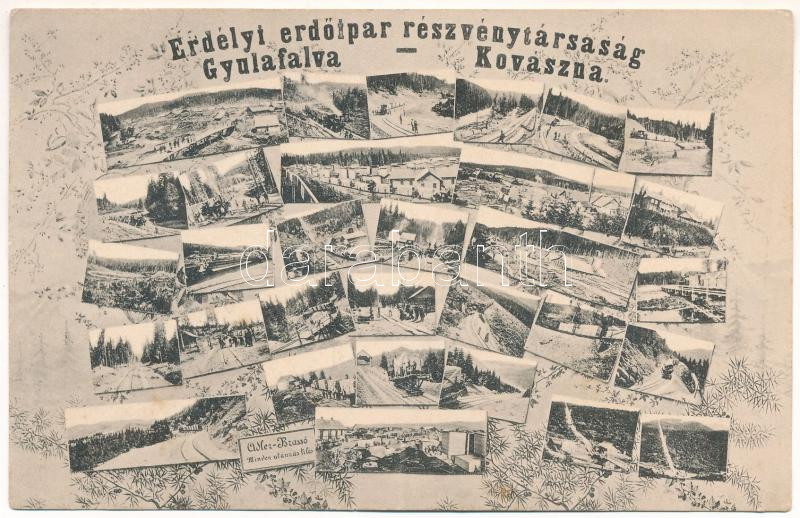 Gyulafalva-Kovászna (Komandó, Comandau), Covasna; Erdélyi erdőipar rt. fűrésztelepek, iparvasút, sikló, gőzmozdony, munkások. Adler fényirda / Transylvanian forest industry, sawmills, industrial railway, funicular, locomotive, workers (EK)