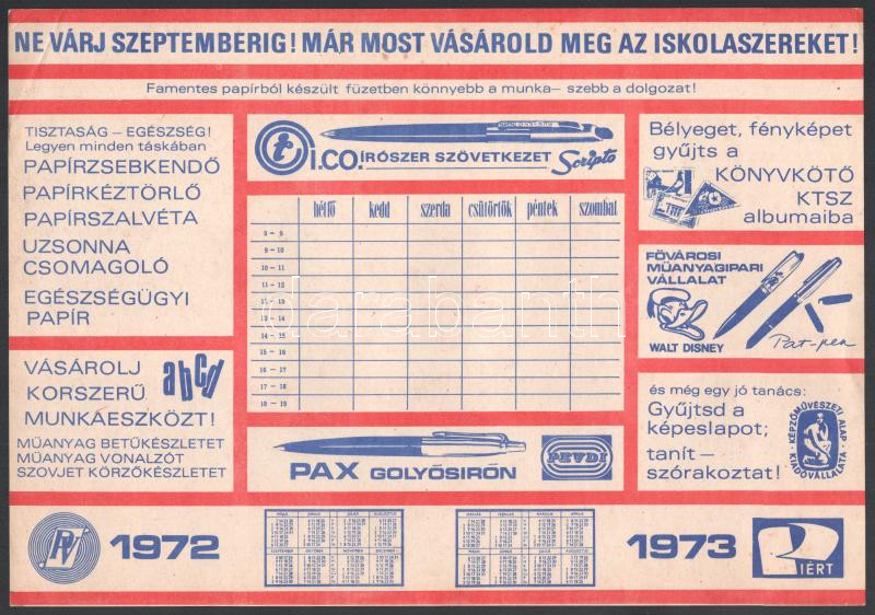 1972-1973 Piért reklámos órarend, kitöltetlen, 29,5x20,5 cm