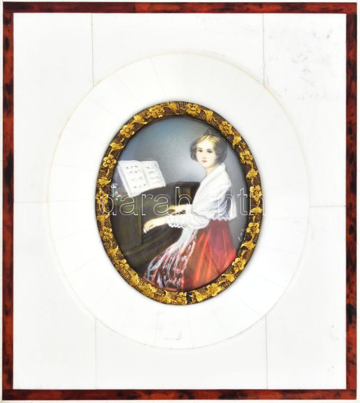 Miniatúra. Zongorázó lány. Csont keretben teknőc páncél berakással. 11...