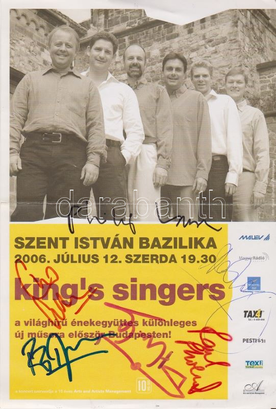 Az 1968-ban alapított The King's Singers brit a cappella együttes fotója a zenekar 2004-2009 közötti felállásában, a Szent István Bazilikában tartott koncertjük alkalmából, az énekesek aláírásával. Készült 2006-ban. Színes, feliratozott brosúra, mérete: 210x147 mm. A felvételt a Zeitenspiegel fotóügynökség megbízásából készítette Frank Schulze. Az oxfordi King's College kórustagjainak baráti társasága az 1960-as évek közepén alapította kizárólag énekhangon alapuló zenei társulatát, melyet egykori iskolájuk iránt tisztelegve The King's Singersnek neveztek el. A kezdetektől hat énekesből álló énekkarban a mai napig változatlan a felállás, két kontratenor, egy tenor, két bariton és egy basszus szólam alkotja a zenekar egyedi, azonnal felismerhető, világszerte ünnepelt hangzását. Az alapítás óta eltelt több mint 50 évben természetesen cserélődtek a tagok, de a zenekar a mai napig a legünnepeltebb a cappella társulatnak számít, mely a legváltozatosabb zenekari, sőt könnyűzenei műveket hangszereli át saját hangzásvilágába, ám a Bazilikában 2006. jókius 12-én tartott koncertjükön a hely szelleméhez alkalmazkodva egyházi kórusfeldolgozások szerepeltek a repertoáron. A fotón a zenekar 2004-2009 közötti felállása látható: David Hurley (kontratenor), Paul Phoenix (tenor), Philip Lawson (bariton), Stephen Connolly (basszus), Christopher Gabbins (bariton), Robin Tyson (kontratenor). Jó állapotú brosúra, hajtásnyommal.