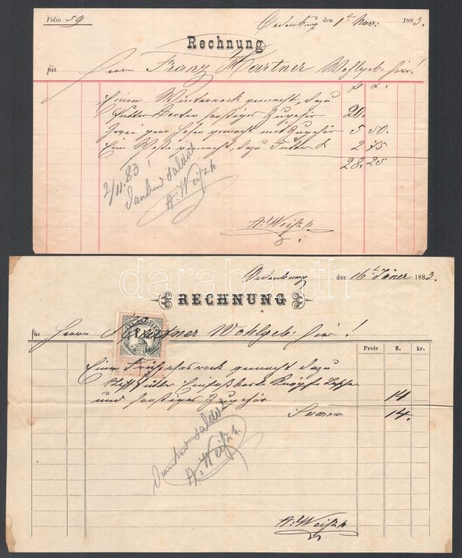 1883 A. Weiss soproni kereskedő német nyelvű ruházati számlái, 2 db, 1 kr. okmánybélyeggel, aláírásokkal, hajtottak.