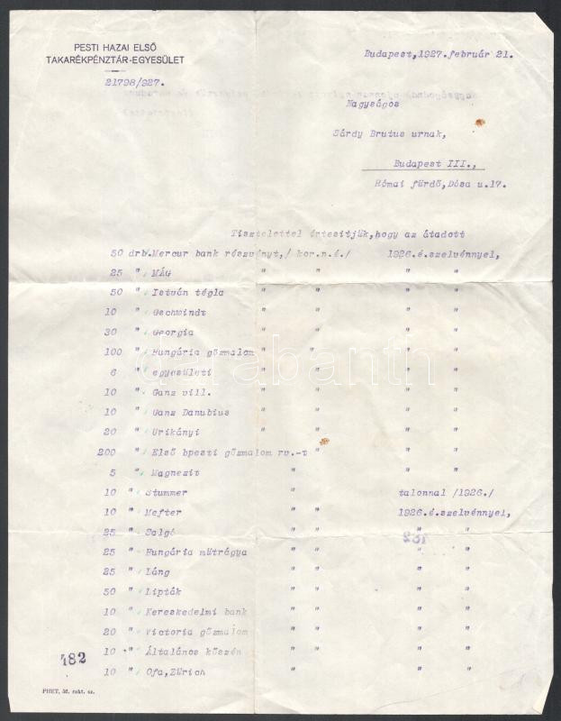 Description: 1927 Sárdy Brutus (1892-1970) festőművész, restaurátor részére a Pesti Hazai Első Takarékpénztár-Egyesület által összeállított lista a letétbe helyezett részvényeiről, bő egy géppel írt oldal, fejléces papíron