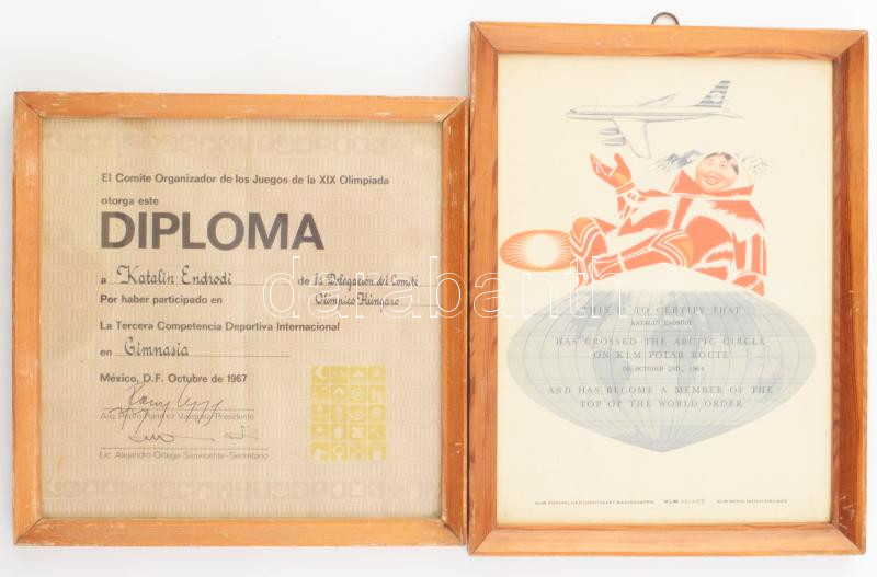 Description: 1964-67 Endrődi Katalin válogatott tornász, olimpikon 2 db "diplomája": 1967 október, Mexikóban rendezett III. Nemzetközi Sporthét versenyen való részvételért, XIX. nyári olimpiai játékok szervezőbizottsága által adományozott, spanyol nyelven és 1964, KLM légitársaságtól az északi sarkkör átrepüléséért, angol nyelve. Mindkettő üvegezett fakeretben