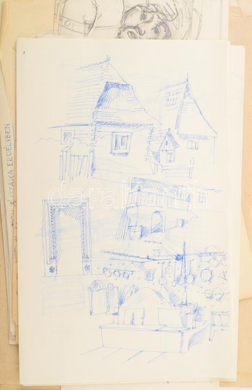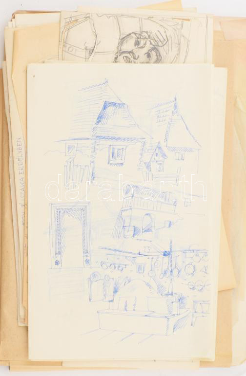 Description: cca 1940-60 Varga Mátyás (1910-2002) grafikus, díszlettervező által készített színpadi látványtervek, feljegyzések, rajzok, közte egy kolozsvári templomi látképpel össz. 70 db. Klf. technikák, papír, jelzés nélkül. Klf. méretekben.