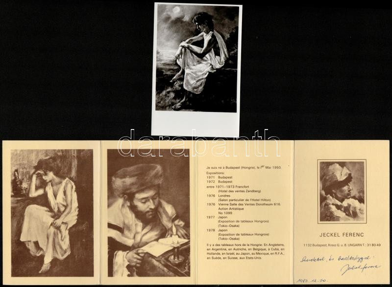 1982 Jeckel Ferenc (1950-2012) festőművész aláírása kihajthatós névjegy lapon és festményét ábrázoló fotólapon