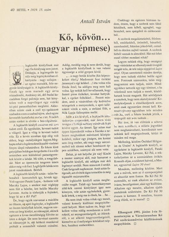 Description: Antall István (szerk.): Kő Pál Bp., 1997, Hangsúly. Színes és fekete-fehér képekkel, Kő Pál szobrainak és rajzainak reprodukcióival gazdagon illusztrált katalógus. Kiadói papírkötés. A tételhez tartozik Antall István 1991-ben Kő Pál kiállításán elhangzott megnyitó beszédének a Hitel c. folyóiratban megjelent változata (újságkivágás).