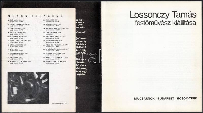 Lossonczy Tamás 2 db kiállítási katalógusa az 1970-es évekből: Kratochwill Mimi (szerk.): Lossonczy Tamás. Bp., 1978, Műcsarnok. Kiadói papírkötés. + Lossonczy Tamás festményei kamarakiállításának ismertető füzete. Bp., 1970, Fényes Adolf Terem. Bp.,. 1970, Lossonczy Tamás. Hajtásnyommal.